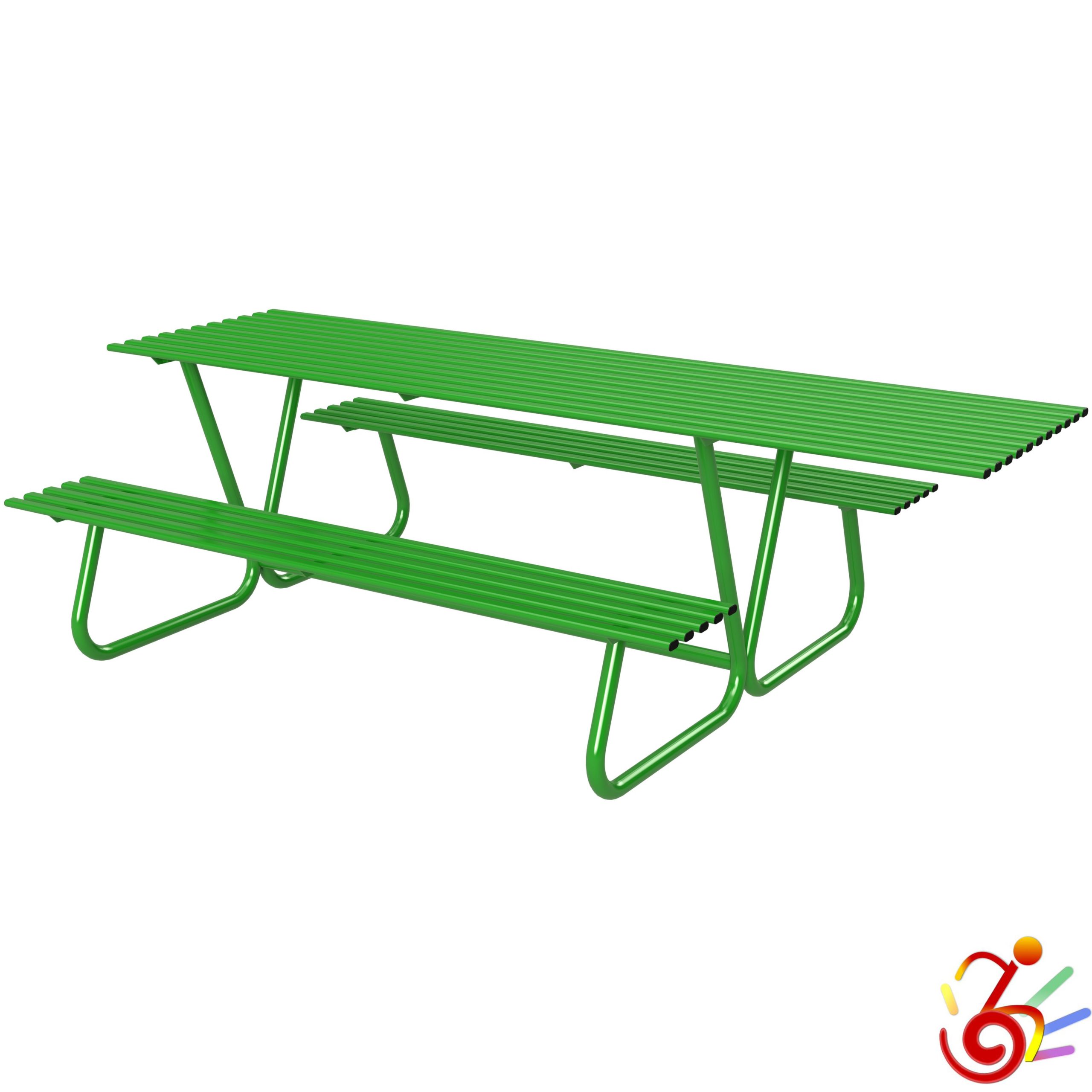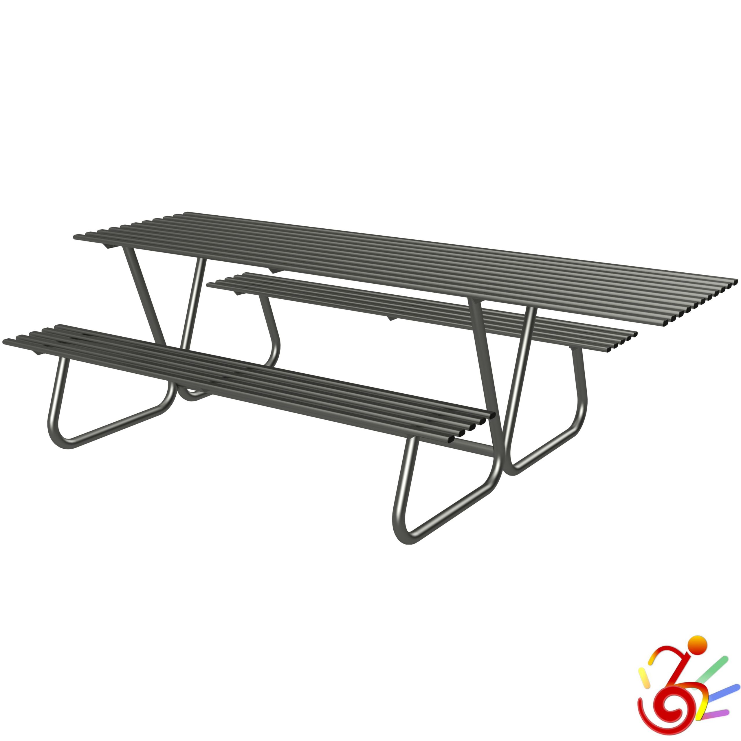 - Composto da un tavolo con piano allungato per permettere l’utilizzo anche a persone non deambulanti, completo di n.2 panche senza schienale incorporate, doghe per le sedute e per il piano del tavolo in tubolare di acciaio, chiusi alle estremità con tappi in polietilene;