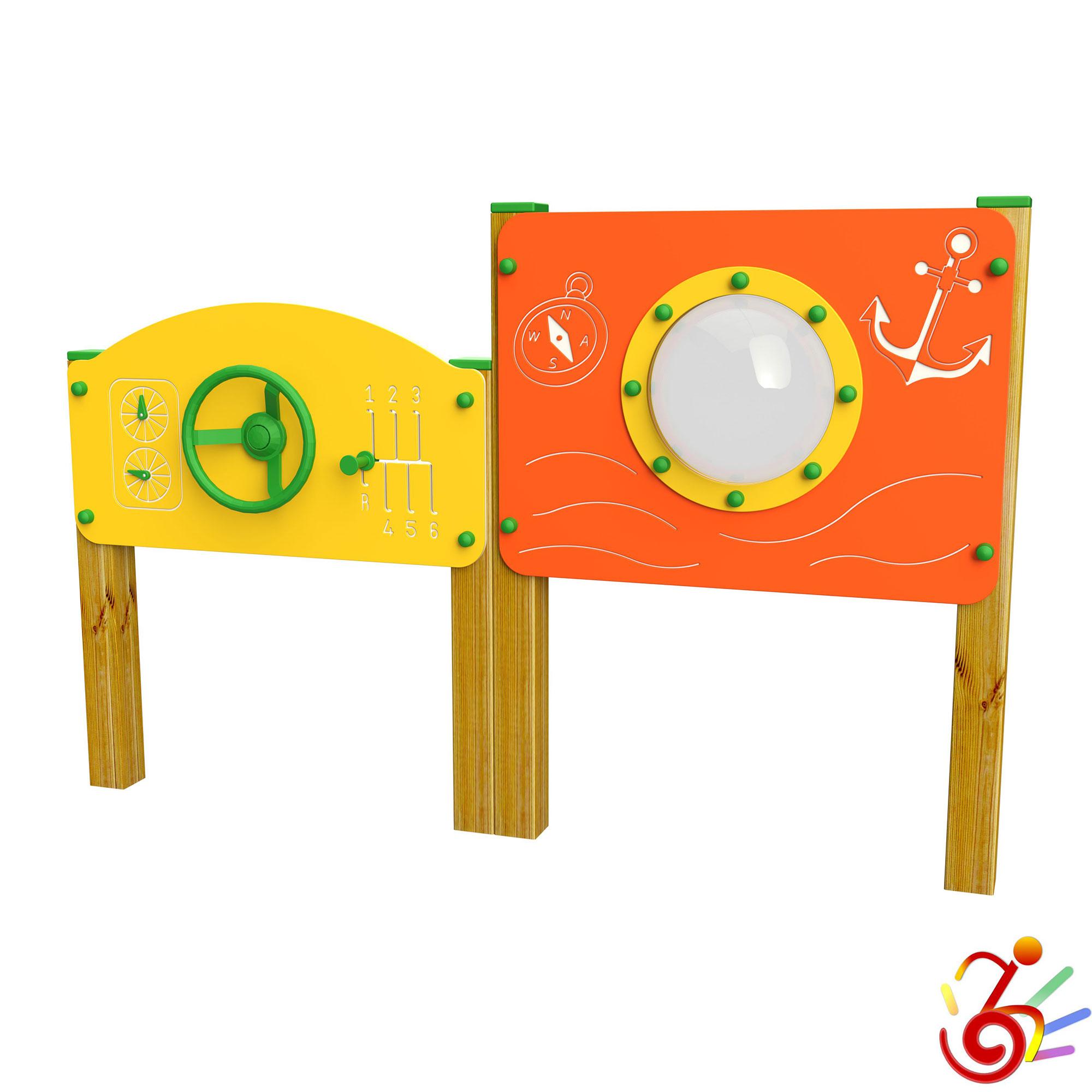 • N.1 pannello MACCHINA in HDPE ANTI-UV RICICLABILE spess.mm.15, dotato di n.2 contachilometri con lancette movibili, n.1 sterzo in polietilene e n.1 cambio marcia con presa per la mano;