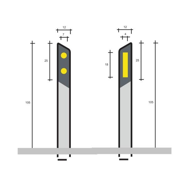 Delineatori normali di margine impiegati lungo le strade extraurbane che indicano i margini visualizzando a distanza l’andamento della strada. La figura evidenzia un esempio di delineatori su strada o carreggiata a senso unico. Su strade a doppio senso di circolazione si impiega il solo tipo Destro su ambo i lati, con colore rosso sul lato destro e con colore bianco sul lato sinistro.