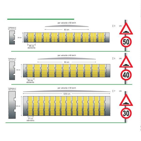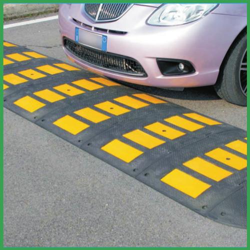 Materia prima: gomma. Moduli ad incastro con visibilità notturna. Le zebrature gialle sono realizzate con materiale elastoplastico rifrangente. Posa in opera mediante tassrlli ad espansione.