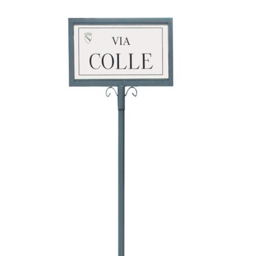Dim. targa cm 50×30 con cornice perimetrale in acciaio verniciato. Fregio decorativo. Palo ø 4.8 h300cm in acciaio zincato